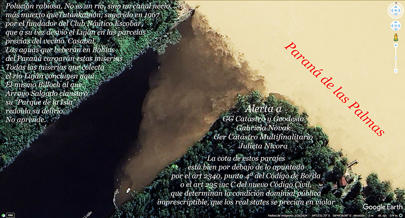 Es indudable que la modalidad de obrar sin tener la previa conformidad de la aptitud de suelo y respeto del art 2340, punto 4º del Código de Borda, del art 235 inc C del Nuevo Cod Civil, del art 59 de la ley prov 10128 y las leyes provinciales 6254 y 8912, conforma un disparate que luego no hay quién lo arregle, a excepción de tener un registro en ARBA, que también será eludido. Así lo prueban las 100.000 parcelas sin registrar en ARBA, a pesar del Dec 1072/2018 y los lavajes de las Res 289 y 400/2019. El problema Sr Gobernador sigue intacto y no se resuelve con crecidas tasas parcelarias. Desde aquella audiencia pública del 2009 en el teatro Seminari en Escobar por Puertos del Lago, no he cesado de denunciar estas ocupaciones de suelos de imprescriptible dominialidad pública, aplicados a los mejores negocios con los peores suelos. No es el comunismo la solución a estos problemas, sino la capacitación y cuidado de profesionales aplicados a vigilar estas tareas en el Estado. Saludo con respeto, FJA, 30/8/2024