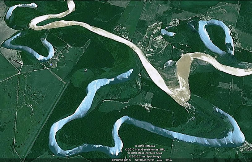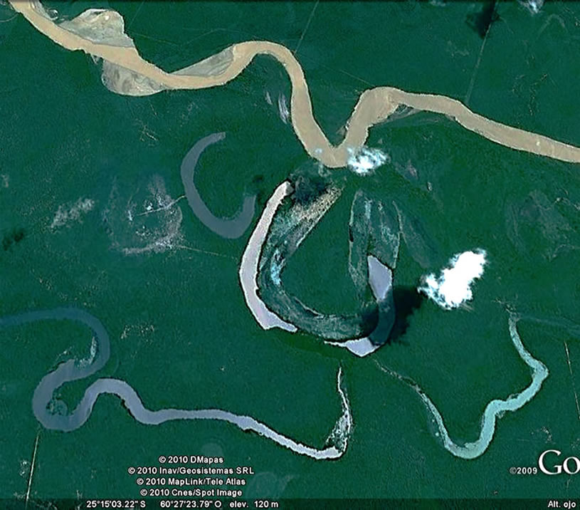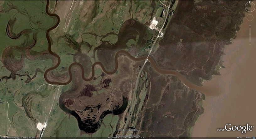 La tesis de Mervilhá es de íntima naturaleza paralítica. Tan paralítica como la ignorancia que pesa en la Causa Matanzas Riachuelo; en donde por defender mirada a los intereses humanos, deciden ignorar cuáles pudieran ser los intereses de los recursos naturales. Así les va. Ver por http://www.alestuariodelplata.com.ar/cortemr.html Y mucho me gustaría imaginar la tesis de Merbilhaá buscando de preservar el dominio de riberas que en algún momento tendrán que aparecer dispuestas a servir a Madre Naturaleza si es que quieren ver a ese arroyuelo fluir. De todas maneras, Merbilhaá no me parece un problema pues él está enfocado en la materia rural. A la palabra hidrología le escapa con presteza pues sabe que tejer criterios hidrológicos cuantitativos en planicies extremas da para cualquier cosa, y jamás ha diferenciado entre hidrología urbana y rural para que todo el mundo esté atento a sus defensas clientelares. Coincido con él en sus comentarios sobre el AdA, el Plan maestro y el desastre de la ley 12257; convengo con el cómo quedó resuelto en este mamotreto el tema de las áreas endorreicas; coincido con él que es algo más que inútil esperar algo de la AdA, de su plan y de su ley; y no coincido con él en la eficiencia de la Fiscalía de Estado que me parece bate récords de ineficiencia. No estoy hablando del roll institucional de la Fiscalía, sino de la extraordinaria inoperancia que en especial, en su Fiscal, allí pesa. Todo este enfoque apuntando a Merbilhaá viene a cuento por ser la única persona que enfrentó durante años las locuras de la ley 12257, con una posición tan bien expresada para defender a sus clientes que pudiera pasar su mensaje como de universal aplicación jurisprudencial a otros territorios donde el naufragio de la administración de las leyes específicas con contenidos hidrológicos por roces interminables con delegaciones que la ley 12257 lleva al ejecutivo a enredar todo, por desconocimiento o desprecio de los marcos de prevención, por la reticencia a respetar la primacía del interés colectivo sobre el particular, por el desprecio de la hidrología urbana, por los pretendidos “saneamientos” de suelos imposibles de sanear, por los asentamientos humanos en valles y planicies de inundación cuyos propietarios pudieran sentir que estas defensas de la dominialidad de Merbilhaá les benefician, pues imaginan que su discurso también apunta a ellos; por todos estos posibles puntos de virtuales encuentros prefiero salir al cruce en este momento que me doy a tratar el tema línea de ribera. A las obranzas el Plan Maestro sólo le bastaban 100 m fijos de ambos lados para tallar las mayores canalizaciones. Pero con mirada desde termodinámica de cursos de agua en planicies extremas esto resulta por completo insuficiente. Esta rama de la fenomenología todavía no ha pisado los umbrales de la modelación. Por lo tanto mejor comenzar a darse cuenta que esas obranzas son inútiles y hasta no tener criterios mucho más ricos sobre estos temas, mejor darse a seguir las recomendaciones de Ameghino. Si las pendientes donde transcurre el Bermejo son mucho mayores que estas de la pampa deprimida y uno descubre la superficie que disponen las meandrificaciones del Salado, ver imagen la dinámica de los meandros de salida