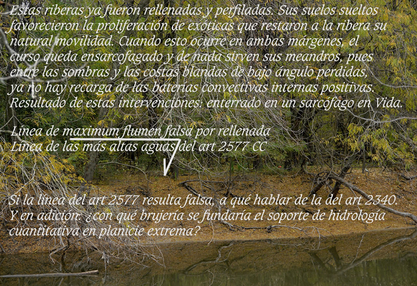 La mención a “línea de ribera de creciente media ordinaria”, con la recurrencia que sea, no sólo es de complicada formulación, sino inútil por donde se la quiera ver. Si lo que buscaba Borda era fortalecer la dominialidad no hubiera logrado nadie hacerlo más inútil y más complicado. En esa complicación paralizante sacó provecho el Dr. Juan Pedro Merbilhaá cuando, defendiendo al sector agropecuario en interminables reuniones en la Autoridad del Agua para fundar reglamentación al art 18 de la ley 1257/98, desarrolló prolijos y a qué negar, muy tendenciosos esfuerzos para fundar aprecios a la dominialidad, que en los grandes y ricos territorios pampeanos bastante más fácil resultará siempre encontrar adeptos. Ver estos aprecios por http://www.lineaderiberaurbana.com.ar/linea14.html Las aristas de su afilado bisturí dejaron en claro que el agua y el cauce, según Borda y según él, -sin otro soporte jurídico que la ausencia de la partícula ilativa y la presencia por el contrario de una coma-, corrían en materia legal, por consideraciones separadas. Y a qué dudar que eso es lo que él imaginó útil para la defensa de sus clientes. Pero no lo que Natura enseña. A pesar de que no querer saber nada con ciencia y técnica porque dice que con frecuencia cambian de forma de pensar –y menos mal que así ocurre porque de lo contrario todas las normas adquirirían el carácter de dogmas-; la pobreza en materia de legislación sobre aguas y sus cauces, incluyendo las avenidas de inundación, supera lo inefable. Incluyendo a Merbilhaá –que sin dudar de su cultura advierto el contrapeso obligado de sus clientes modelando el restringido campo de visión al que él atiende. Y aunque nadie que esté buscando cuidar sus dominios propicie echar una mirada más rica y específica a estos temas, ya me resulta imposible no destacar la orfandad de esta legislación con la realidad natural. Que si las tradiciones humanas cuentan, las naturales cuentan mucho más. Los dogmas científicos, ya no los jurídicos, también son responsables de encierros lamentables, que pesan como al parecer pocos imaginan en la causa Matanzas Riachuelo. Ver http://www.alestuariodelplata.com.ar/cortemr.html
