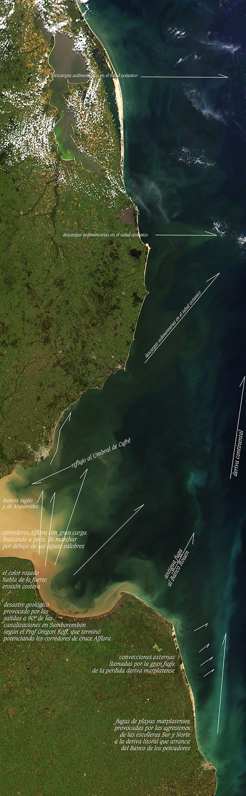 Ningún laboratorio del planeta ha modelizado tales pendientes; y por ello hemos quedado dependientes de modelaciones extrapoladas de una energía gravitacional fabulada. No es mi culpa y tampoco la de Beni. Sí por el contrario, haber firmado esas autorizaciones para dragar, que aún no sabiendo nada de regímenes convectivos, no cabía que ignorara el crimen hidrogeológico que se dio a originar con esas autorizaciones para el churrete que jamás debería haber firmado, porque ninguna necesidad había de dragar “por razones de navegabilidad”, que según insiste es su única misión a considerar. Descuidó Beni su holgada estancia en una función técnica sin dedicar tiempo a enriquecer sus capacidades cognitivas, siendo que sus responsabilidades exceden en mucho la materia legal. Ni siquiera fue capaz de distinguir entre el “régimen del Río” y lo que tantos creen ver en un régimen hidráulico. Pero lo más grave, reitero, han sido los estragos criminales en el Puelches, fruto de esos dragados que vengo denunciando en dos decenas de causas en SCJPBA. El Tratado del Río de la Plata exhibiendo orfandad completa respecto del marco de energías presentes en el estuario –tan bien resumidas en esa expresión de compromiso: “Régimen el Río”-, le acerca a la situación de Beni un cómodo marco de relatividad de lo que era dable esperar de un funcionario que jamás metió sus pies en el agua. Esa es parte de la realidad que apunto en estas conclusiones que siguen.
