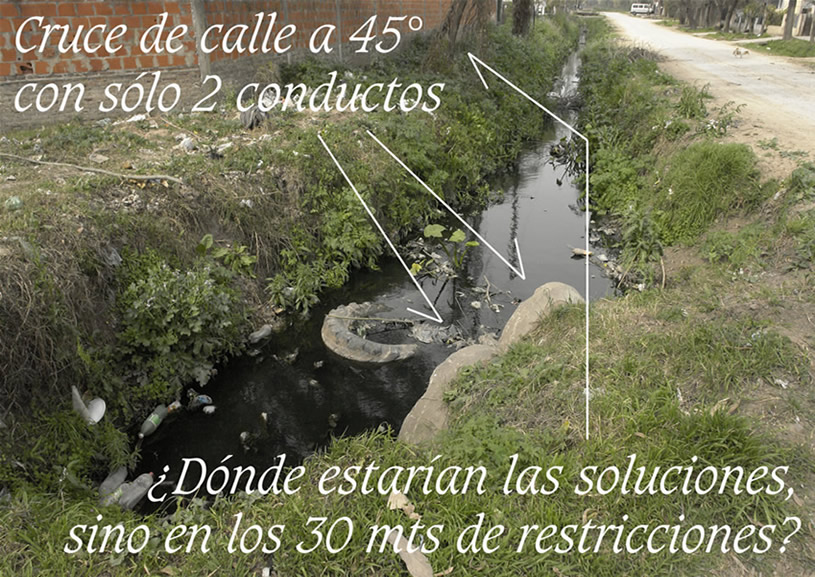 Barrio Los Sauces dirimiendo sus torpezas en causa 67491 en Suprema Corte Su vecino la Lomada le acusa de haber colocado 5.000 m3 en terraplenes y no confiesa los 350.000 m3 que él mismo colocó enfrente del que denuncia. Está claro que ese vecino, el más importante mercader de la zona y por entonces Secretario de Gobierno y Hacienda del municipio del Pilar, se apoyaba y se sigue apoyando en un poder ejemplar que alguien heredará en vicios y otras comodidades. En las imágenes que siguen vemos una canalización obrada con la guía del ejecutivo provincial en la década del 50, que aún permanece inalterada mostrando el progreso del Escobar actual en la saludable meseta a cota 25 m. Tan sorprendentes ejemplos contrastan con los proyectos de un Plan Estratégico para ocupar todos los humedales cuyo promedio de cota ronda el 1,5 m IGM. Que para resolver la cota de arranque de obra permanente generarán rellenos despanzurrando el Querandinense, eliminando el Pampeano y descabezando el Puelches. Al frente de tan creativas propuestas está el octogenario magister en Ética Ambiental titular de cátedra en el FLACAM cuyo fundador se gasta las suelas viajando por el mundo dando conferencias sobre sustentabilidad ambiental. Con esta maravilla de criaturas y los científicos adormecidos, el misterio terrenal es realidad. http://www.delriolujan.com.ar/incorte6.html