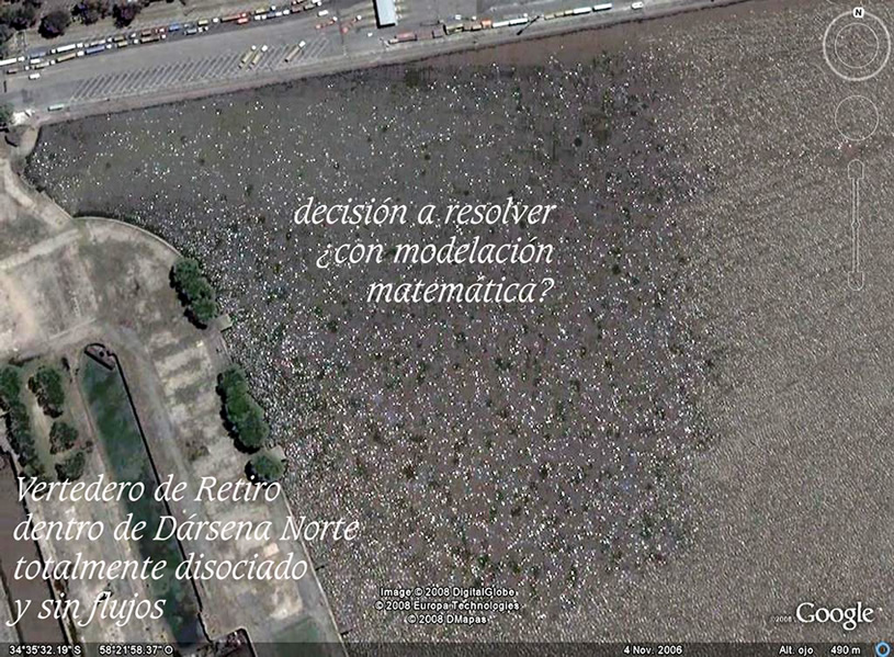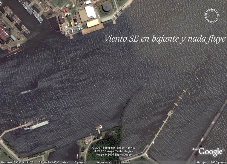 En el horizonte que imagino cercano y enriquecido por esta fenomenología termodinámica de aguas someras en planicies extremas, el primer enfoque apunta a la trascendencia de ese particular segmento de flujos convectivos internos naturales positivos, únicos responsables de asistir la dinámica superficial en planicies extremas; en puntual contraste con los lamentables pretendidos flujos de las aguas en los sarcófagos que durante siglos nuestros ingenieros hidráulicos estuvieron construyendo. Que serán útiles también para comenzar a estudiar las previsiones mediterráneas de Buenos Aires y la calidad de los flujos que pudieran considerarse en el sector interno y externo a la nueva área peninsular al Este del Emilio Mitre, ahora que la relación ancho profundidad de este sector estuarial recibe de regalo este inevitable cambio de escenario que cabe sospechar fuera de mínimo provecho. Y el valor de advertirlo y considerarlo reconociendo no haber forjado experiencias, permitirá aprender un poco más de lo poco que sobre este rincón del estuario sabemos y a partir de estos avances iluminar mínimas prospectivas del devenir mediterráneo de Buenos Aires que es inconcebible no adviertan la trascendencia que tienen en todos los planes hidráulicos que a la ciudad le vienen negando; ocultando las décadas que la hidráulica se tomó como descanso para ir adormeciendo. Los puntitos blancos en la imagen que sigue son bolsitas de plástico en el vertedero de Retiro. La diferencia de grises marca la disociación hidroquímica y térmica de los flujos fríos que al salir del túnel provocan sedimentación. ¿A qué hacer un estudio de carga másica, si aquí no hay flujos?