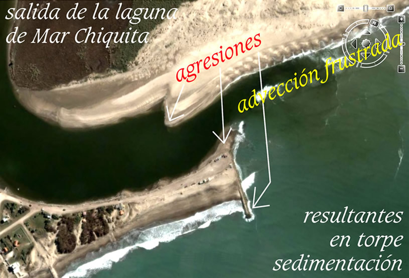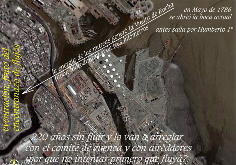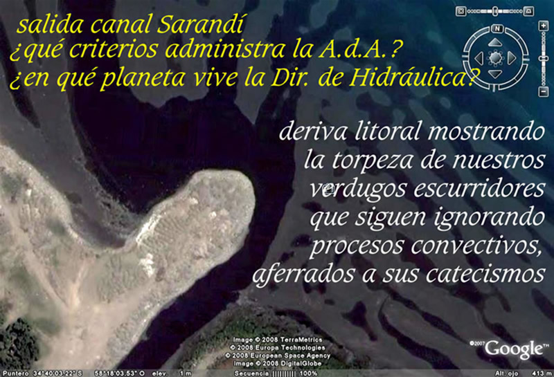 Aclaro, que en esta mentira, osadía, fantasía o como quieran llamarla, hay un detalle curioso y es el que descubre a este recorrido en dirección opuesta a las pendientes naturales del sector hacia el O; que si bien ínfimas, ya prueban que a los 80 años este proyectista no deja de ser creador. Lástima que no sea conciente de las magnas ilicitudes que genera en todo su alrededor; que no representa esta tontería ni la millonésima ava parte de las barbaridades consagradas en sus proyectos. Al despanzurrar todos los suelos comiéndose crudo el impermeable Querandinense y el filtrante Pampeano hasta llegar a descabezar al Puelches, las tendencias piezométricas de estos mantos con surgencias naturales en la región asumen otra dimensión. Y por ello, supongo, la necesidad de evacuar algo de ellas apuntando al camino más corto por el ENE. De todas maneras estas iniciativas prueban que las energías mercaderes no encuentran en ciencia clara compensación, ni siquiera declarativa que les ayuden a obrar con mayor previsión, sin violar en forma brutal, códigos y leyes naturales elementales todos los días y en todas sus obras en la misma región, sin haber ninguna de sus modalidades cambiado, a pesar de lo mucho que es de imaginar tendrían que haber aprendido en algo más que dos largas décadas desde que en los bajos de Mildberg inauguraran criminales desatinos hidrogeológicos que nadie en todos estos años apareció dispuesto a señalar, denunciar y demandar; siendo que hasta la propia Justicia debió obrar de oficio por ello; pero mucho más el Instituto Nacional del Agua que teniendo clarísima conciencia de la extrema gravedad de estos incomparables atropellos fueron a buscar a un hortelano para que se ocupara de poner el grito en el cielo. Pero todas estas laxitudes de conciencia son apenas una migaja de la contrastada desestructuración que les espera por haber forzado a la mecánica de flujos a modelar milagros que saltan a la vista nunca dieron otros resultados que los tapones sedimentarios y por ende, las funestas cuencas devenidas endorreicas que hoy nadie alcanza a resolver desde mirada al recurso natural, pretendiendo que el cultural les alcance el remedio. Ver este desenfoque en http://www.alestuariodelplata.com.ar/cortemr.html