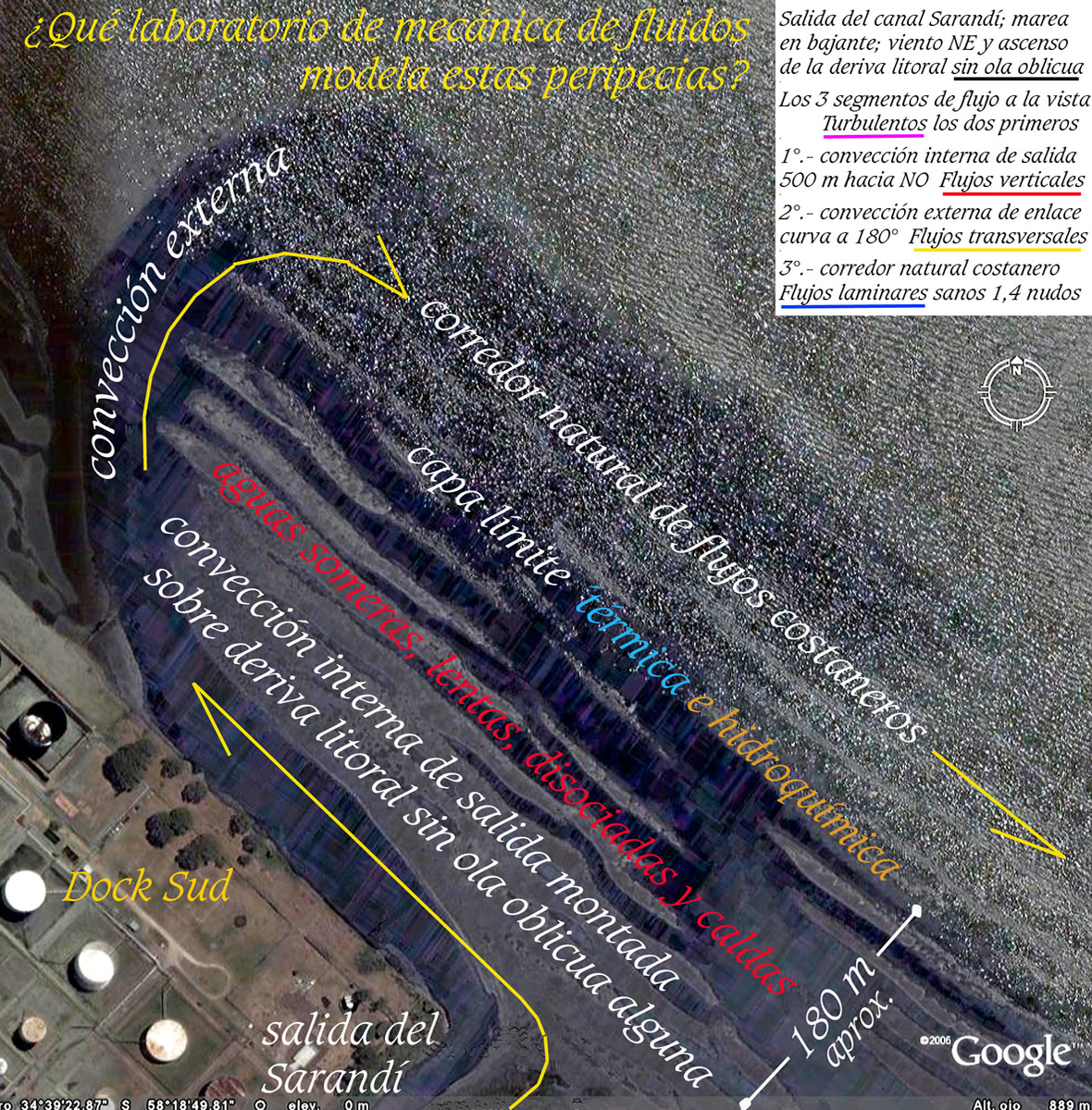Hablar entonces de fenomenología termodinámica de aguas someras en planicies extremas merece dejar una ventana abierta a la contemplación de estas fenomenologías en nuestros comportamientos, porque de lo contrario muchas ilusiones, buenas y malas, se cargarán a espaldas de la primera esperando milagros. Milagros se nos regalan todos los días, pero apreciando nuestros Ángeles, tras los esfuerzos humanos hacer guarida. - . Plumas de hidrocarburos subidas desde el Dock Sud que muestran meterse en directo por convexión externa dentro de las tomas de agua de Palermo. Y sin que Petroni haya logrado siquiera imaginarlas como variables en su modelación, el fenómeno hace su aparición en nuestro sentidos.