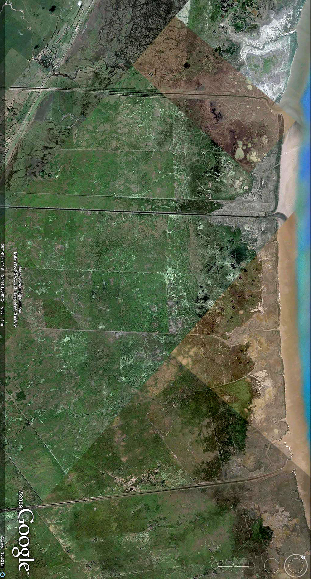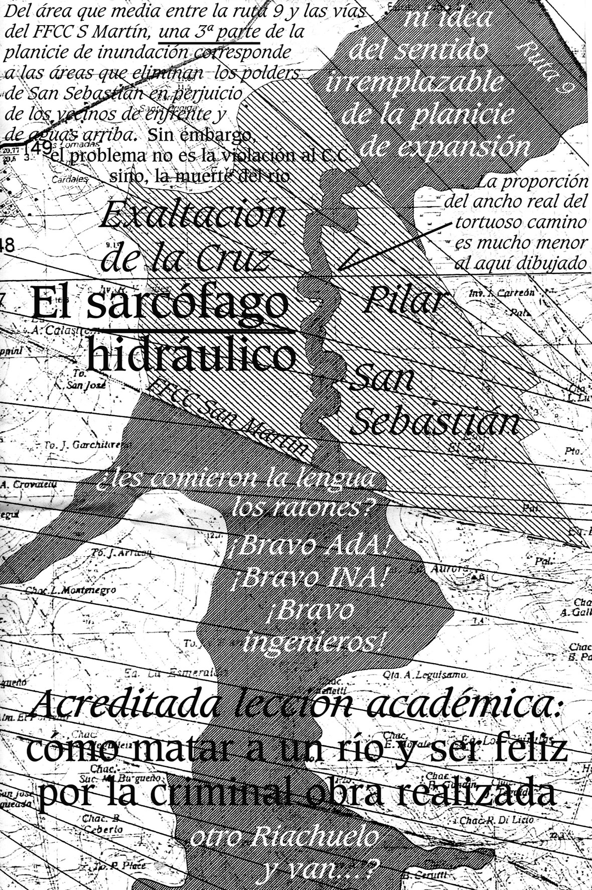 Ríos muertos para probar criterios verdugos 1) Riachuelo. 2) Aliviador del Reconquista. 3) Sarandí y Sto Domingo. 4) Canal 15 y otros en Samborombón. Todos con la misma concepción del sarcófago hidráulico modelando flujos laminares en planicies extremas. Concepción que habla de las miserias, al parecer, inagotables, del imperativo analógico matemático. A deducir, el éxito que le espera al plan Matanzas Riachuelo. Ver x http://www.alestuariodelplata.com.ar/cortemr.html Mientras tanto, las hierbas de la planicie, aún anegadas hacen su aporte para que el agua se mueva.